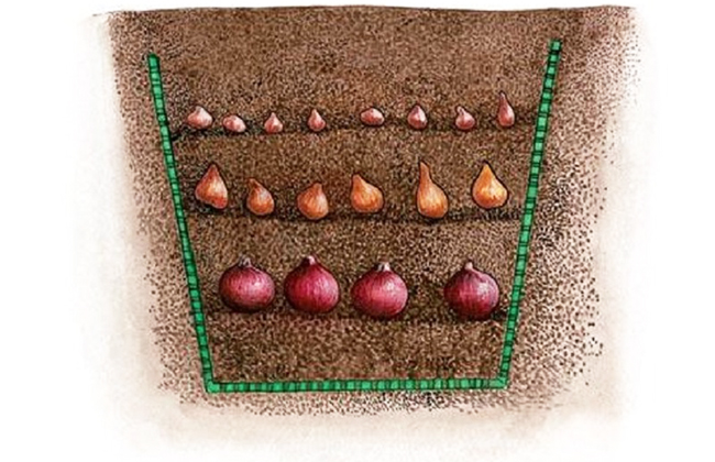 Начинают посадку с больших, крупных луковиц, которые закапывают глубже, а затем засыпают почвой в 3 — 5 см. Далее выкладывают слой более мелких луковиц и также засыпают их почвой. Так можно сделать несколько ярусов, а самые мелкие луковички садят ближе всего к поверхности.