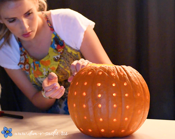 Конечно, такое украшение из тыкв на Хэллоуин своими руками достаточно трудоемкое, но очень атмосферное!